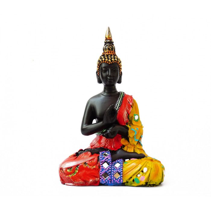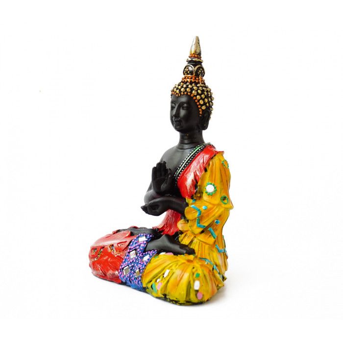 Амогхасиддхи сидит, выставив правую ладонь вперёд в абхая мудре – жесте, символизирующем бесстрашие, защиту от опасности. Это движение использовал и Будда Шакьямуни, с полной уверенностью, что победит, когда отражал нападки Мары.