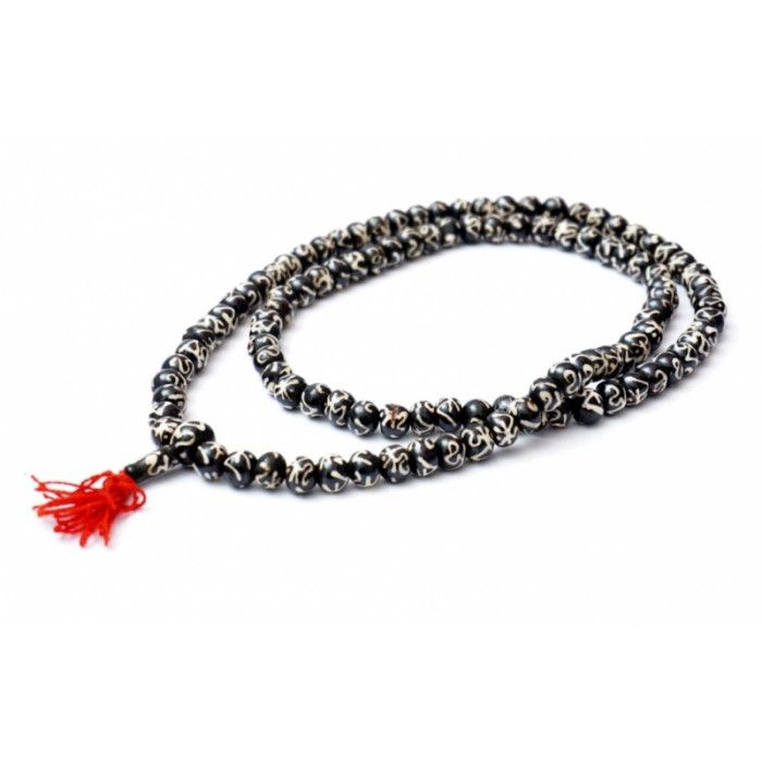 Чотки з кістки ОМ Санскрит чорні + білий малюнок 10 мм.